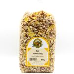 HAFERFLOCKEN, WEIZENFLOCKEN, Cornflakes (Mais, Zucker, Salz, GERSTENMALZ), Honig-Dinkel 16% (DINKEL gepufft, Honig), Honig-Weizen 10% (WEIZEN gepufft, Honig), GERSTENFLOCKEN, Trockenfrüchte 7% (Äpfel, Himbeeren, Sauerkirschen), Reismehl